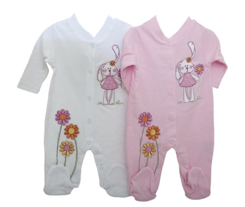 Baby Girls Long Sleeve Embroidered Rabbit and Flower Design Baby Sleepsuit (0-3 Months) (White)