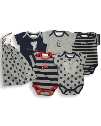 Really Essential! Our 5 pack of bodysuits are made from 100% finest cotton so really soft against baby's skin.They have an envelope shaped neck which means you can pop over baby's head really easily. Fully poppered opening for easy nappy changing. They come with a self fabric drawstring bag - really practical (and free!) Every new mum needs lots of these.
