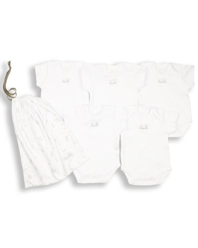 Really Essential! Our 5 pack of bodysuits are made from 100% finest cotton so really soft against baby's skin.They have an envelope shaped neck which means you can pop over baby's head really easily. Fully poppered opening for easy nappy changing. They come with a self fabric drawstring bag - really practical (and free!) Every new mum needs lots of these.
