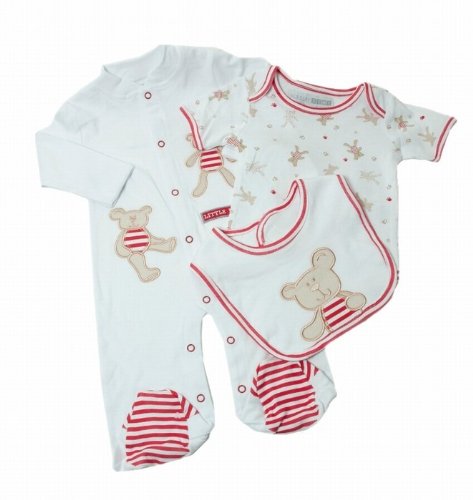 Baby Sleepsuit & Bodysuit Set with Bib Bear Design, Allergy Free (Newborn) (White/Red)