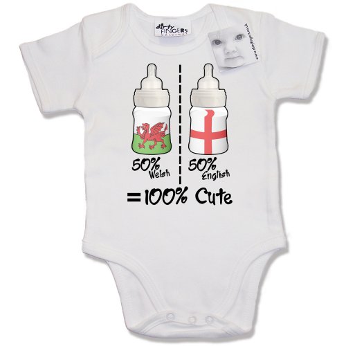 Dirty Fingers - 50% Welsh, 50% English = 100% Cute - Baby & Toddler Short Sleeve Bodysuit / BabyGrow, 0-3 months, White