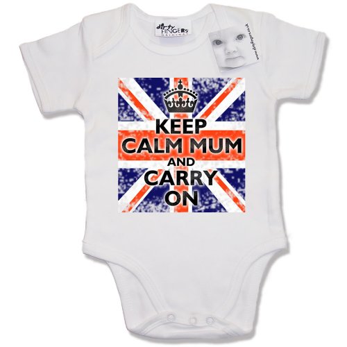 Dirty Fingers - Keep Calm Mum and Carry On (with flag) - Baby & Toddler Short Sleeve Bodysuit / BabyGrow, 0-3 months, White