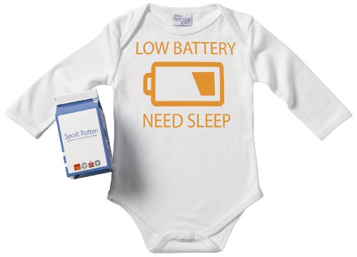 Spoilt Rotten - Low Battery, Need Sleep Long Sleeve Babygro / Bodysuit Funny Slogan 100% Organic Sizes 6-12 months + in funky Milk Carton WHITE