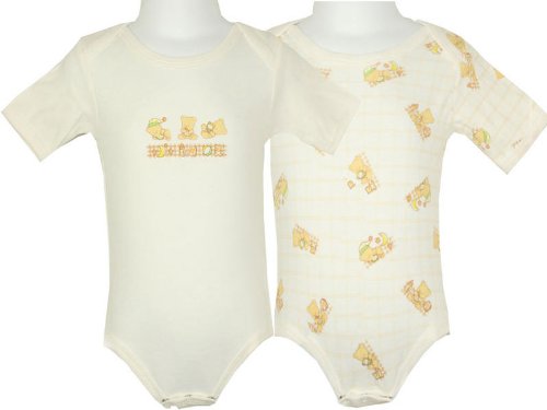 Unisex baby 2 pack of bodysuits in cream & beige. Both have envelope necks and popper fasteners. 100% soft cotton