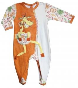 This Hooliganskids babygrow has two poppers at the back of neck and around crouch for easy changing. It has a fun Giraffe Grinning applique on the front with legs coming out of a patch pocket and below.