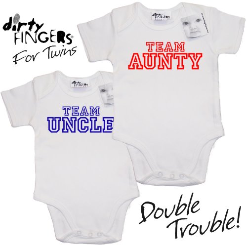 Dirty Fingers - For Twins - TEAM AUNTY & TEAM UNCLE - 2 x Baby & Toddler Short Sleeve Bodysuits / Baby Grows, 0-3 months, White & White
