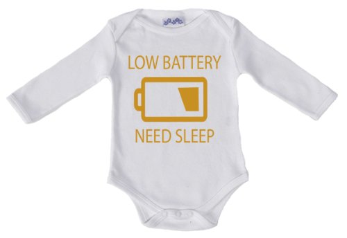 Spoilt Rotten - Low Battery, Need Sleep Long Sleeve Babygros / Bodysuit Alternative Baby Clothes 100% Organic Sizes 0-6 months WHITE/BLACK