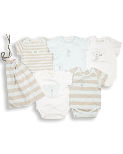 Really Essential! Our 5 pack of bodysuits are made from 100% finest cotton so really soft against baby's skin.They have an envelope shaped neck which means you can pop over baby's head really easily. Fully poppered opening for easy nappy changing. They come with a self fabric drawstring bag - really practical (and free!) Every new mum needs lots of these.