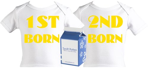 Spoilt Rotten - 1st Born And 2nd Born Twin Set Baby & Toddler Retro T-Shirt 100% Organic Sizes 0-6 months WHITE/BLACK + in funky Milk Carton